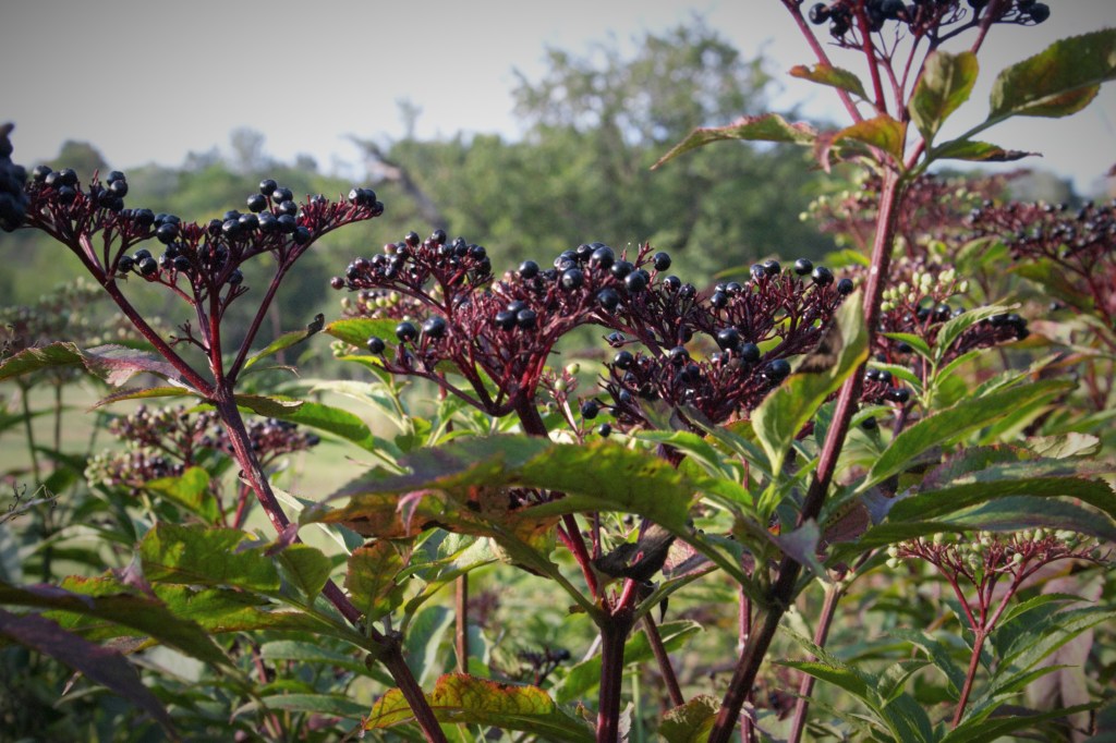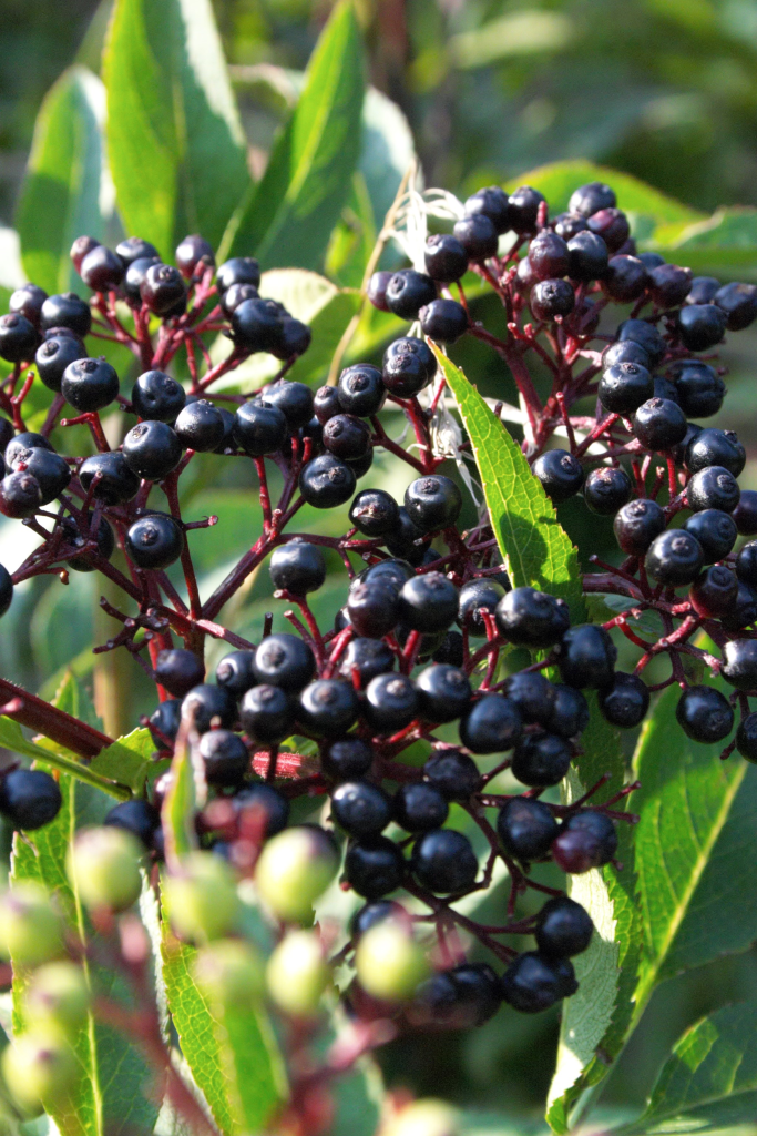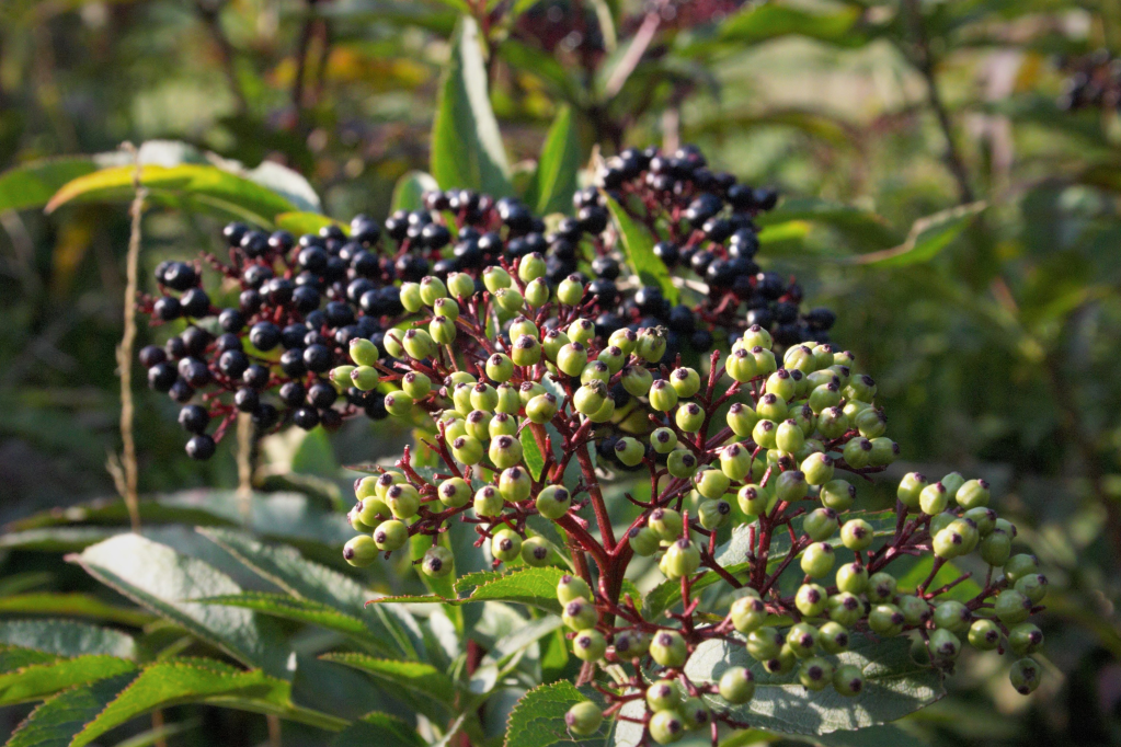 Eigentlich sind die Holunderbeeren Steinobst. Sie sollten immer über 80 Grad erhitzt werden. Damit werden cyanogene Glykoside abgebaut. Der Name deutet es schon an, ein Pflanzengift. Leider wird dann auch sehr viel Vitamin C zerstört. Dafür hat die Fliederbeere B-Vitamine, Magnesium, Kalium und Eisen zu bieten. Sein dunkler Farbstoff ist ein Anthocyan. Dieser sekundäre Pflanzenstoff schützt Zellen vor Alterung und krankheitsbedingten Veränderungen. Deshalb ist er bei Arthrose sehr empfehlenswert. Blaubeeren, Brombeeren oder Pflaumen sind das auch.