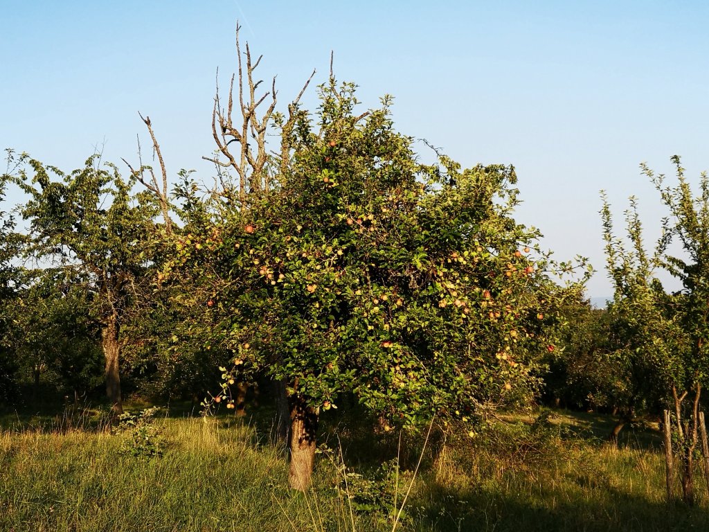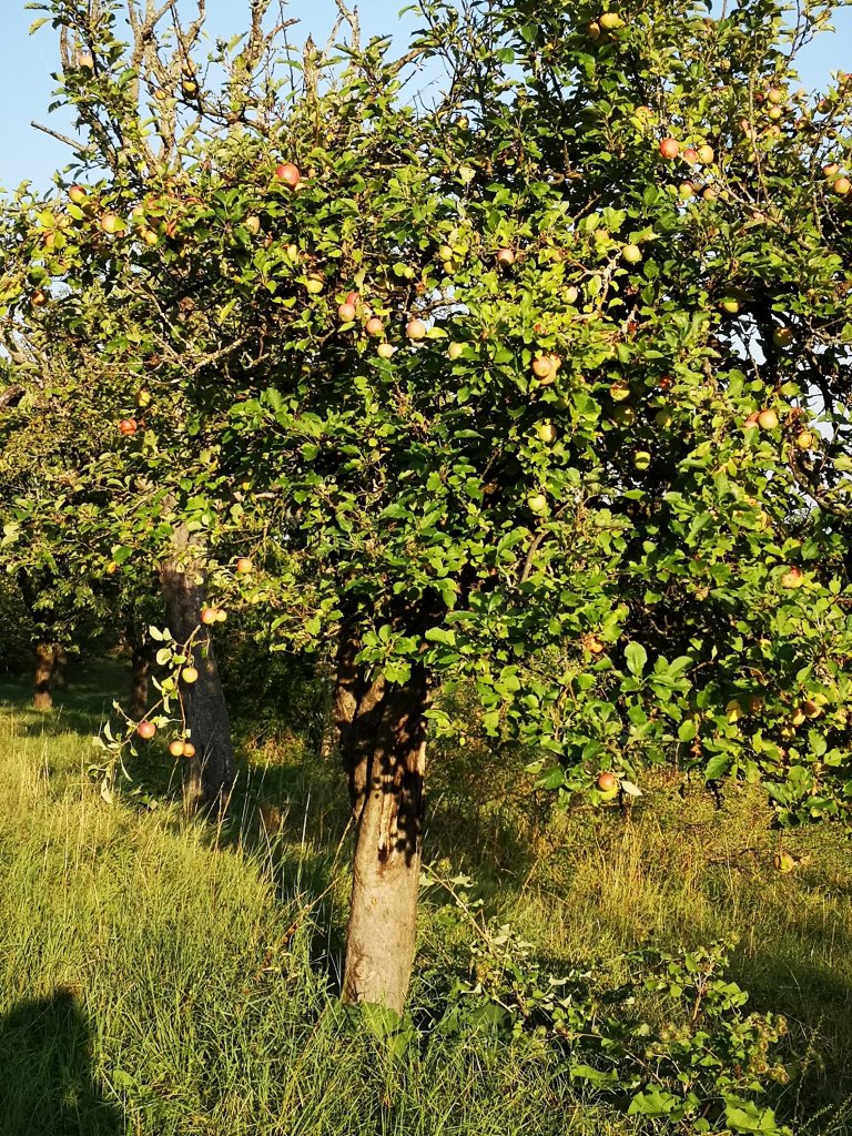 Ganz in meiner Nähe lädt ein Naturschutzgebiet mit Apfelbäumen und Streuobstwiesen zum Spazieren oder Rad fahren ein. Die Temperaturen waren hoch. Trotzdem konnte ich es dort im Schatten sehr gut aushalten. Natürlich habe ich Äpfel gepflückt, ein paar Pflaumen und Brombeeren genascht.